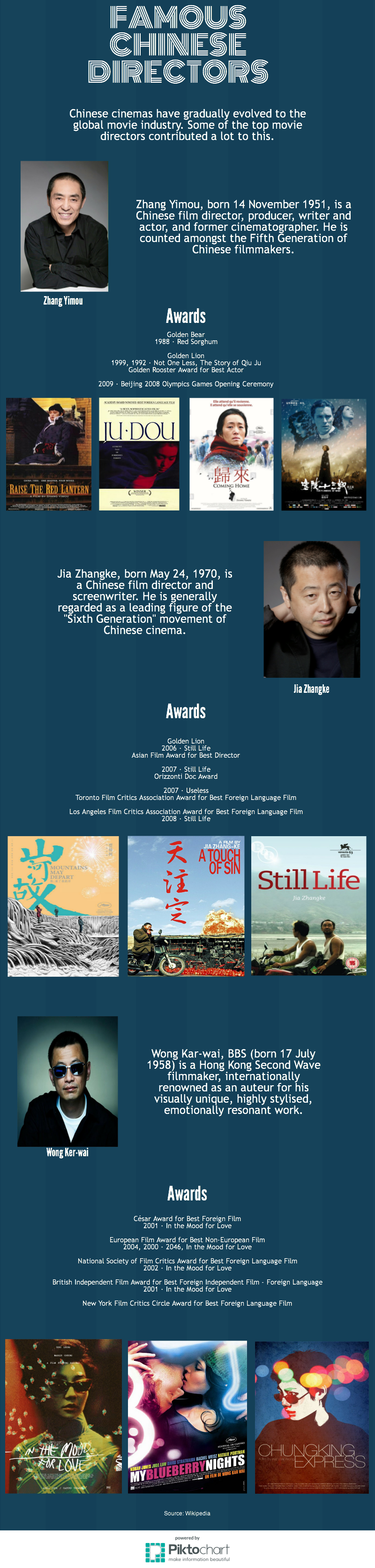Directors such as Wong Kar Wai, Zhang Yimou and Jia Zhangke are the three biggest chinese directors who have maintained a regular audience in UK (http://www.cffuk.org/).